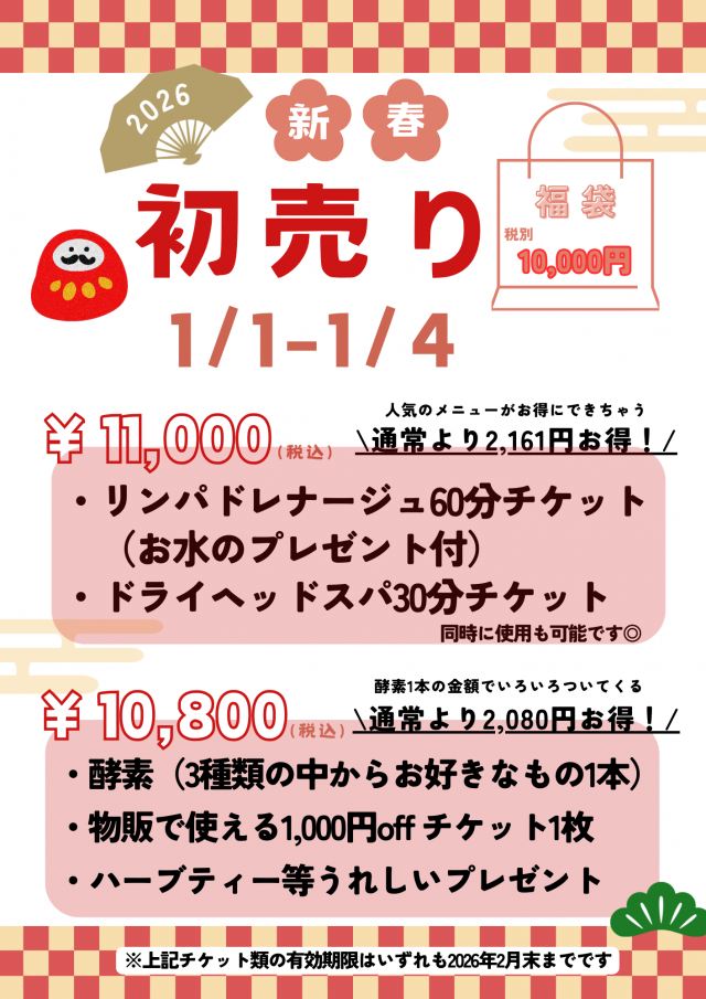 | 新年あけましておめでとうございます!! 旧年中は格別なご高配を賜り厚く御礼申し上げます。 本年もより一層のご支援を賜りますよう、従業員一同心よりお願い申し上げます。 今年もやってきました\(^o^)/福袋のお知らせです♪ 2026年福袋は1月1日から4日まで販売いたします♪ ◆◆◆ 2026 新春福袋 ◆◆◆ 今年はリラクゼーション、フェイシャルエステ、酵素ドリンクの3種類です!! チケット、酵素ドリンクの商品など大変お得にご購入して頂けます☆ ◎リラクゼーション福袋 11000円・・・2161円お得♪ ・リンパドレナージュ60分チケット ・ドライヘッドスパ30分チケット ・ファストプロウォーター付き ◎エステフェイシャル福袋 11000円・・・2750円お得♪ ・顔脱毛1回チケット ・美肌パック ◎酵素ドリンク福袋 10800円・・・2160円お得♪ ・「酵素ドリンク ハーブザイム113プロ」1本(プレーンorジンジャーorオラックス) ・物販で使える1000円OFFチケット1枚 ・1080円相当のプレゼント(ハーブティー等) ※チケットの有効期限は、2026年2月末までとなっております。 ※数量限定ですので、在庫が無くなり次第終了となります。 気になる方はお早目にお買い求めくださいませ。 ♪♪♪ スタッフ一同、皆様のご来店を心よりお待ちしています ♪♪♪> |