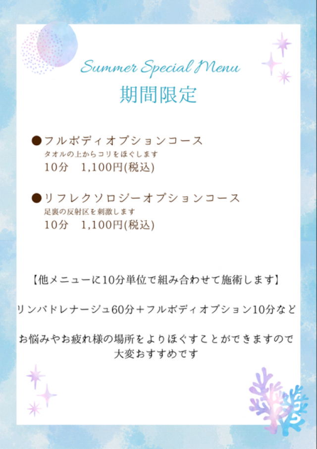| 【期間限定】オプションコースのご案内 各10分 1,100円(税込) ○フルボディ:首・肩・腰など、お疲れの箇所をもみほぐします。 ○リフレクソロジー:足裏の各器官や臓器に通じる反射区を刺激し身体の内側へアプローチ!代謝を上げてむくみ解消にも効果的♪ <オススメコース> ☆ リンパドレナージュ60分+リフレクソロジー10分 9,020円(税込) リンパドレナージュでリンパの流れを整えて、更にお疲れ箇所をしっかりケア♪リフレクソロジーで足裏の反射区を刺激して代謝アップ。 ☆フルボディ40分+リフレクソロジ-10分 5500円(税込) お疲れ部分やコリのもみほぐしと足裏の反射区を刺激して、体の内側へもアプローチしていきます。全身しっかりケアできて、お身体スッキリ ※単品で10分のみのご利用は出来ません。 ※リンパドレナージュコースは女性限定です。 お疲れに合わせて組み合わせていただけます。 この機会に是非お越しくださいませ♪ |