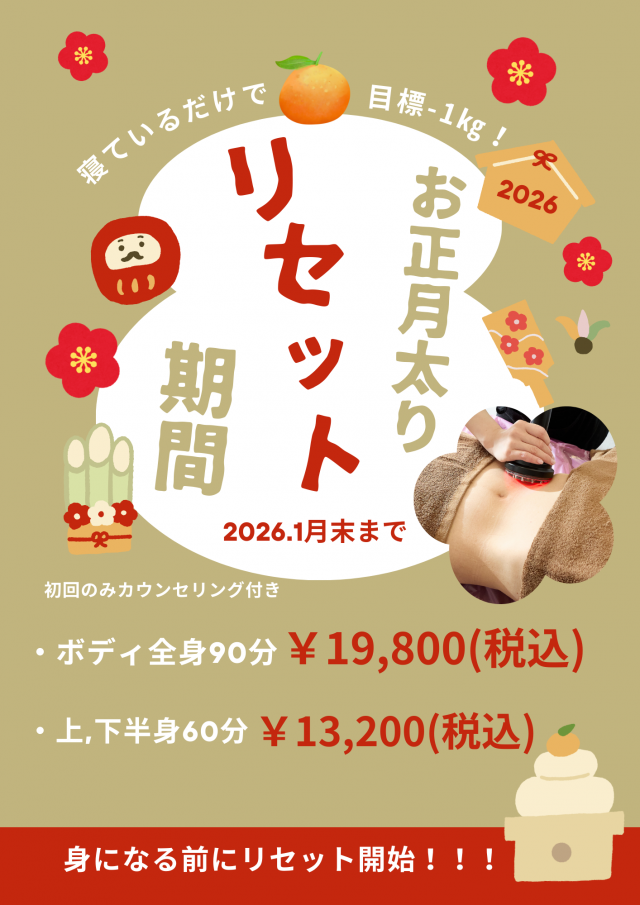 | <痩身オススメコース> ~お正月太りリセット期間~ 1月限定コース 何度でもご利用できます!! キャビテーション+ラジオ波+セル吸い上げ 高機能マシンで気になる脂肪を燃焼! 好きな服をキレイに着こなせて、いいことずくめの痩身ケアを始めましょう。 1回90分の全身痩身で7000カロリー=-1Kgを目指す! ◇全身 1回90分 19,800円(税込) ◇下半身or上半身 1回60分 13,200円(税込) 施術内容 ・ヒートマット・キャビテーション・吸引 ●代謝が落ちて痩せにくい方 ●きれいに痩せたい方 ●本格的ダイエットされたい方 ぜひお手伝いさせてください! 《注意事項》 ◆持病をお持ちの方、通院中の方、飲み薬・塗り薬を使用の方は施術できない場合がございます。 <痩身 キャビテーション・ラジオ波・聴周波> ◇糖尿病 ◇高血圧 ◇体内に金属が入ってる方(ペースメーカー糖) ◇皮膚疾患をお持ちの方 ※事前にかかりつけの担当医にご確認ください。 ◆妊娠中の方、生理中の方は施術できません。 ◆未成年・学生の方は親権者の同意書が必要となります。 今年こそは痩身メニューでダイエットの一歩を踏み出しましょう!! きれいに痩せたい方のお手伝いできることをスタッフ一同、心よりお待ちしております☆彡 |